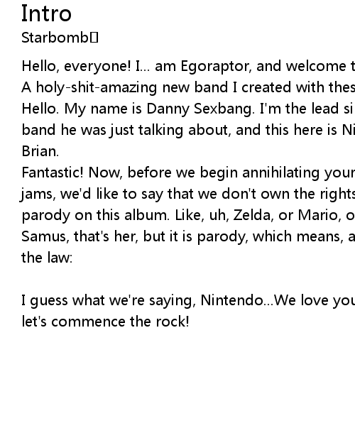 | Hello, everyone! I... am Egoraptor, and welcome to the first album of Starbomb! A holy-shit-amazing new band I created with these guys Ninja Sex Party. | |