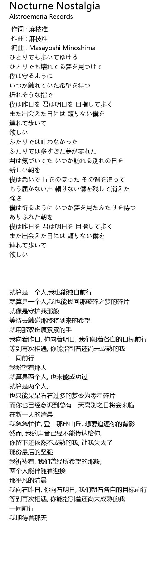 | [02:20.100] | 僕は昨日を 君は明日を 目指して歩く |