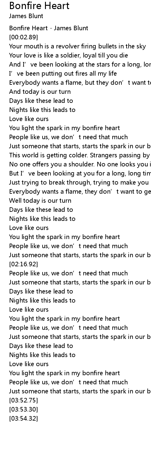 | [00:00.00] | Bonfire Heart - James Blunt |