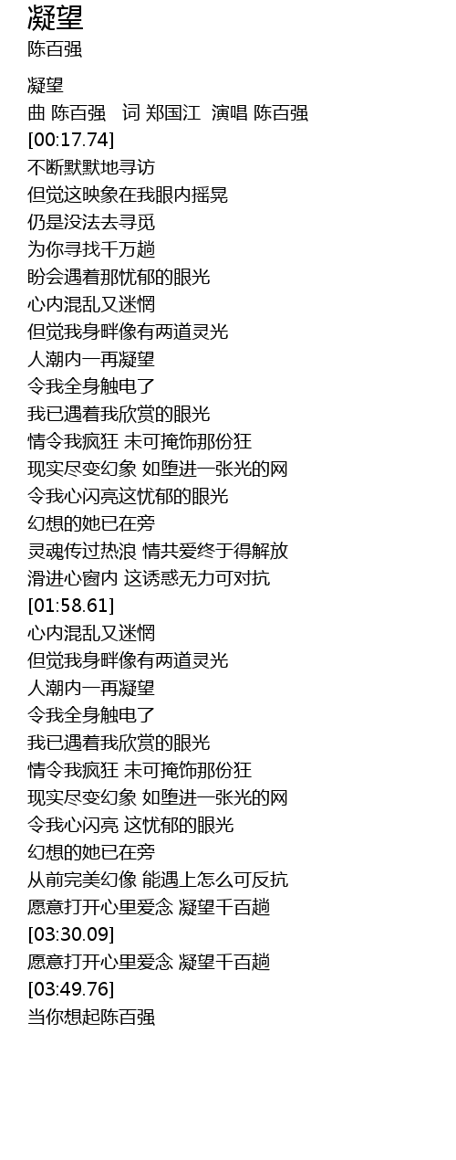 | [00:05.69] | 曲 陈百强 词 郑国江 演唱 陈百强 |