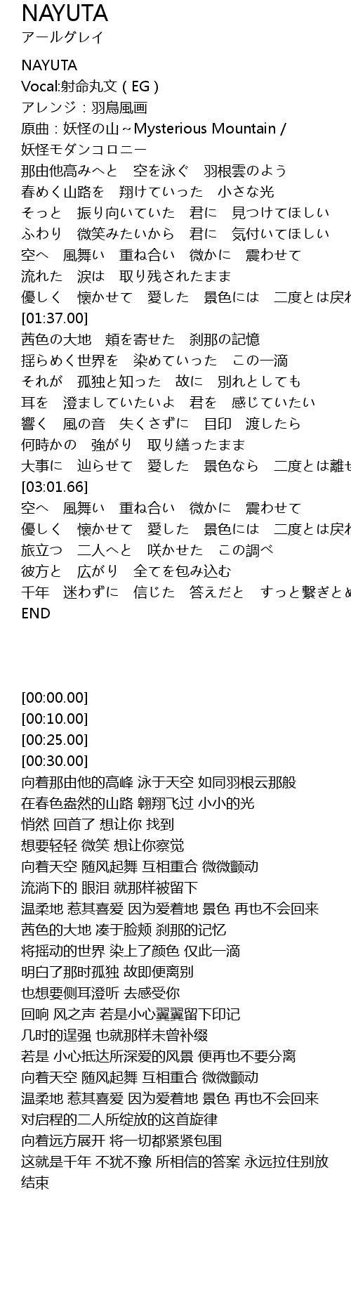 | [00:30.00] | 原曲:妖怪の山~Mysterious Mountain / 妖怪モダンコロニー |