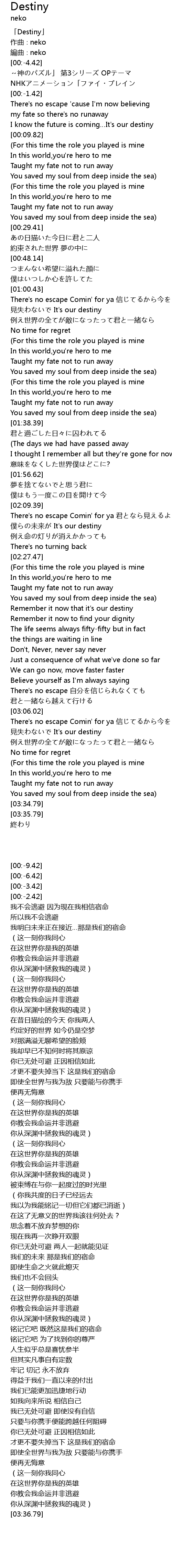 | [00:00.42] | 我不会逃避 因为现在我相信宿命 |
