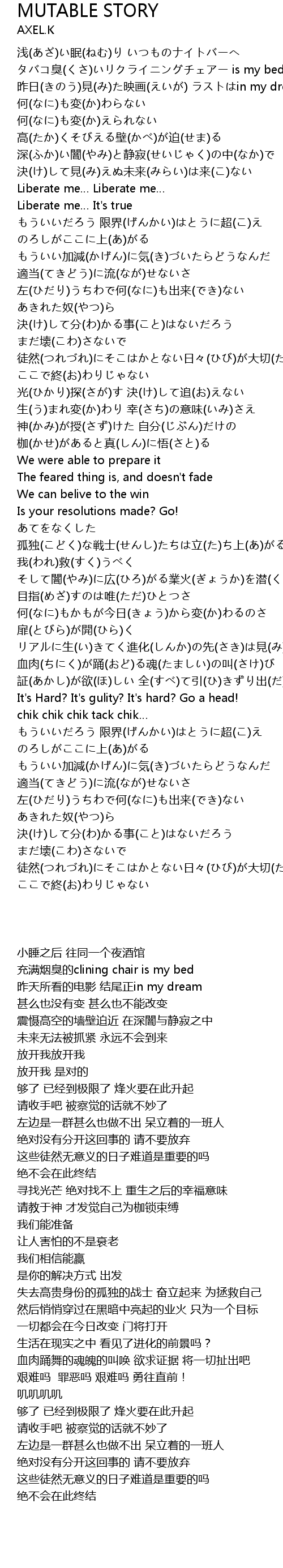 | [04:24.910] | もういい加減(かげん)に気(き)づいたらどうなんだ 適当(てきどう)に流(なが)せないさ |