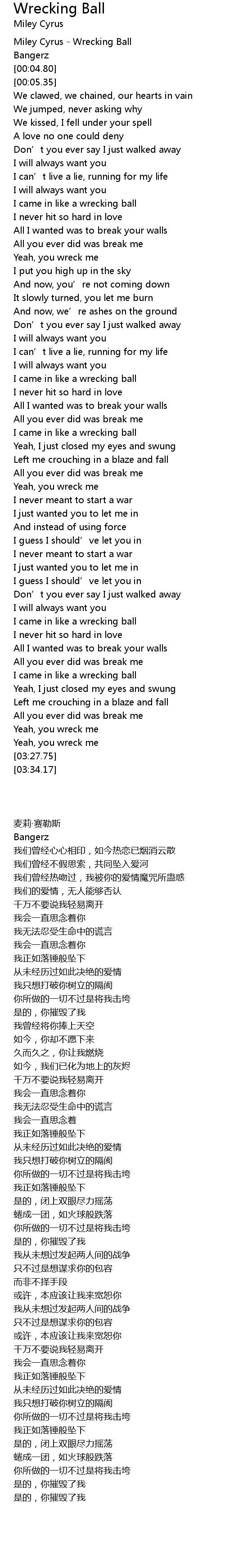 | [00:02.82] | Miley Cyrus - Wrecking Ball |