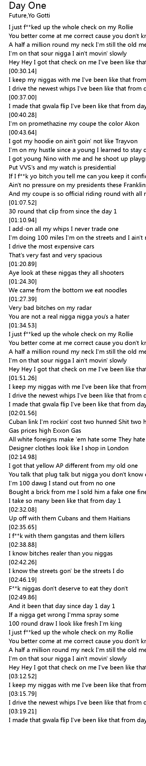 | [03:13.17] | I keep my niggas with me I've been like that from day 1 |