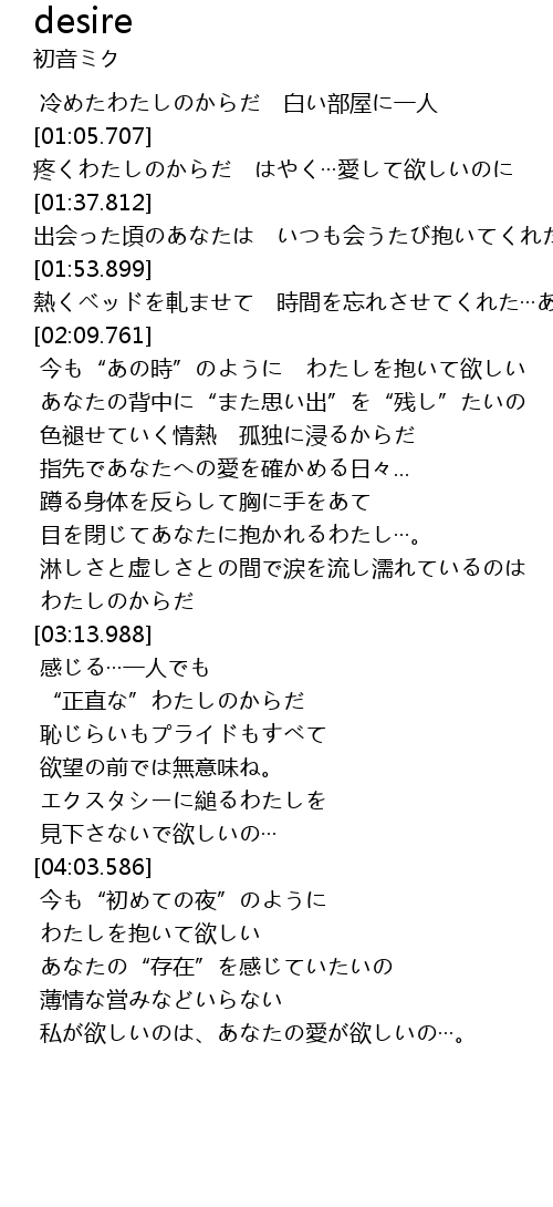 | [01:05.707] | 疼くわたしのからだ はやく···愛して欲しいのに |