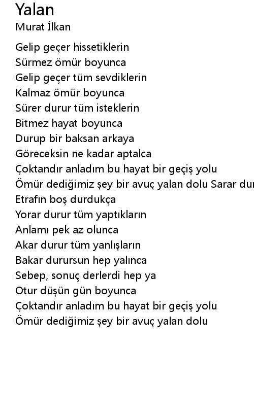 | Ömür dediğimiz şey bir avuç yalan dolu Sarar durur tüm taktıkların | |