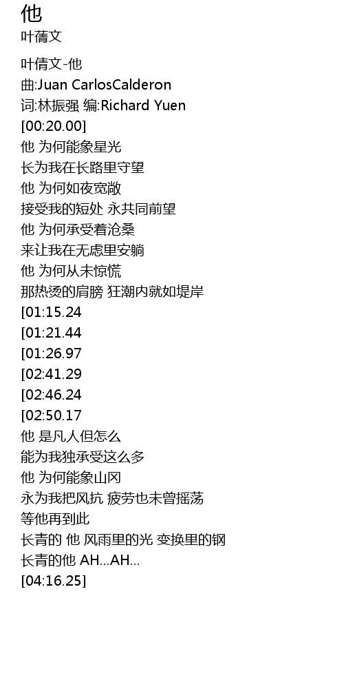 | [00:16.00] | 词:林振强 编:Richard Yuen |