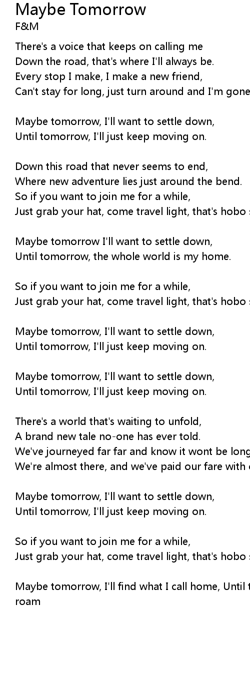 Maybe tomorrow, I'll find what I call home, Until tomorrow, you know I'm free to roam