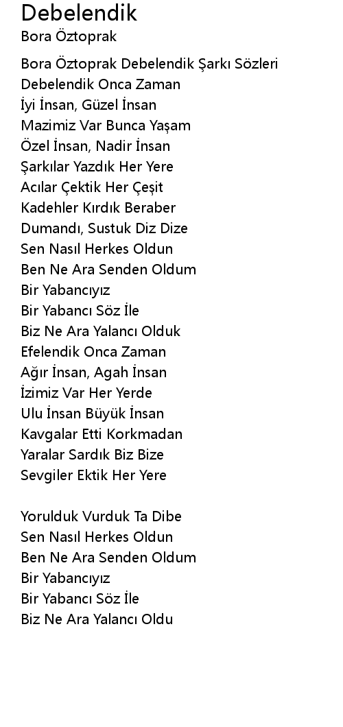 | Bora Öztoprak Debelendik Şarkı Sözleri | |