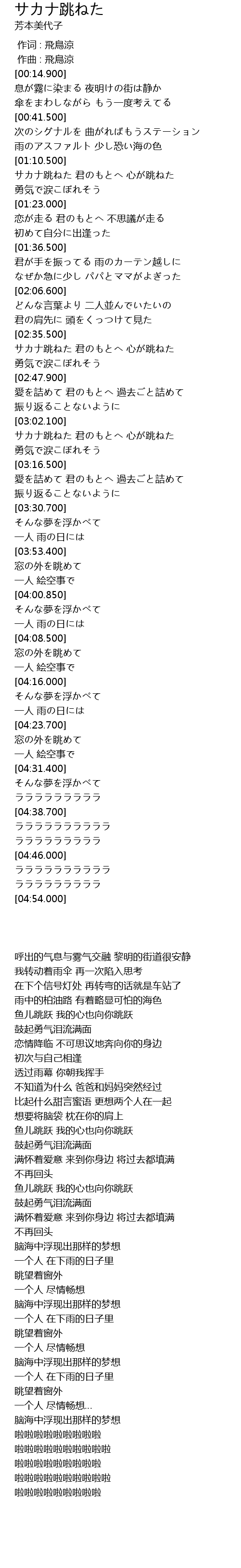 | [03:05.400] | サカナ跳ねた 君のもとへ 心が跳ねた |
