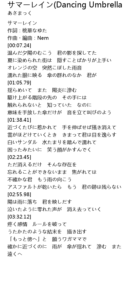 | [02:08.09] | 白いサンダル 水たまりを踏んで濡れて |