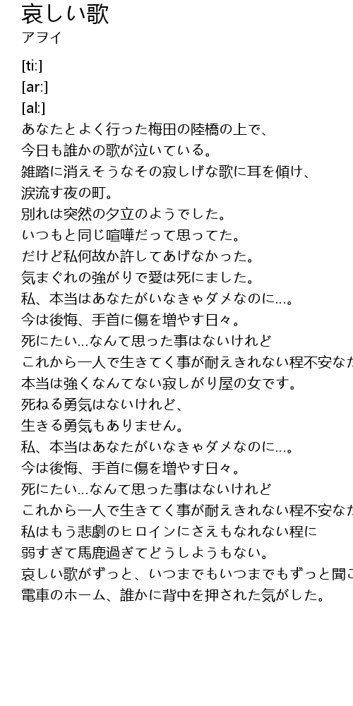 | [03:57.41] | 哀しい歌がずっと、いつまでもいつまでもずっと聞こえてくるよ。 |