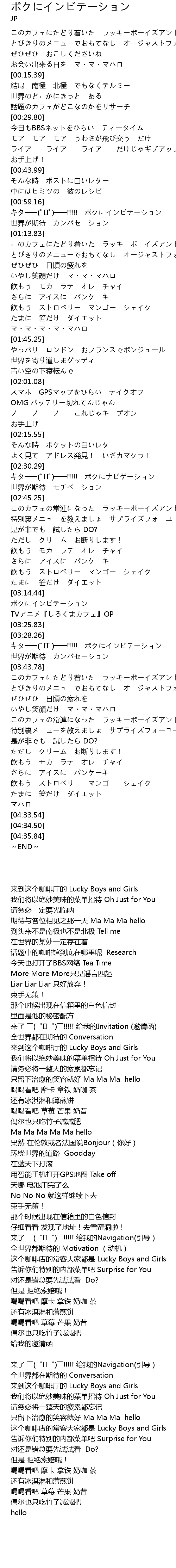 | [03:44.78] | このカフェにたどり着いた ラッキーボーイズアンドガールズ |