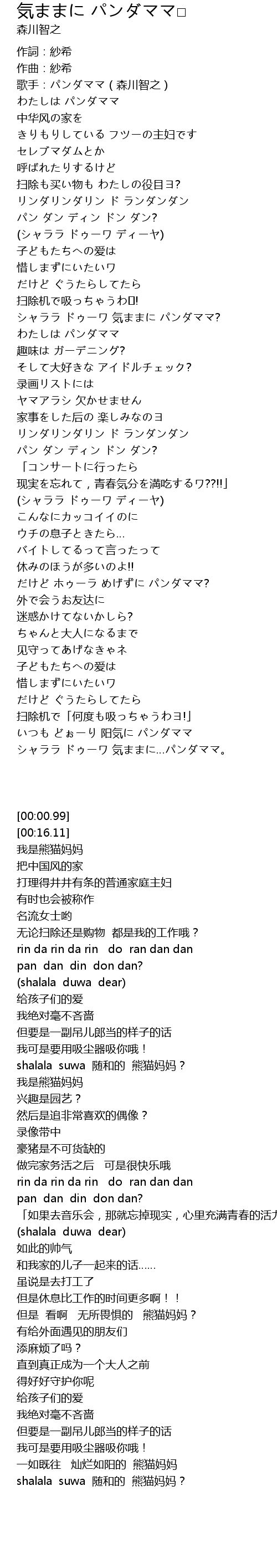 | [00:16.11] | 歌手:パンダママ(森川智之) |