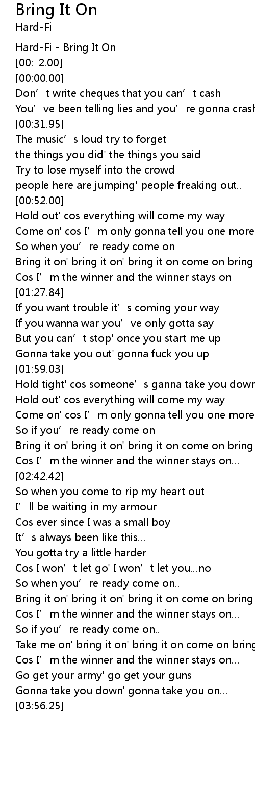 | [02:29.44] | Bring it on' bring it on' bring it on come on bring it on |