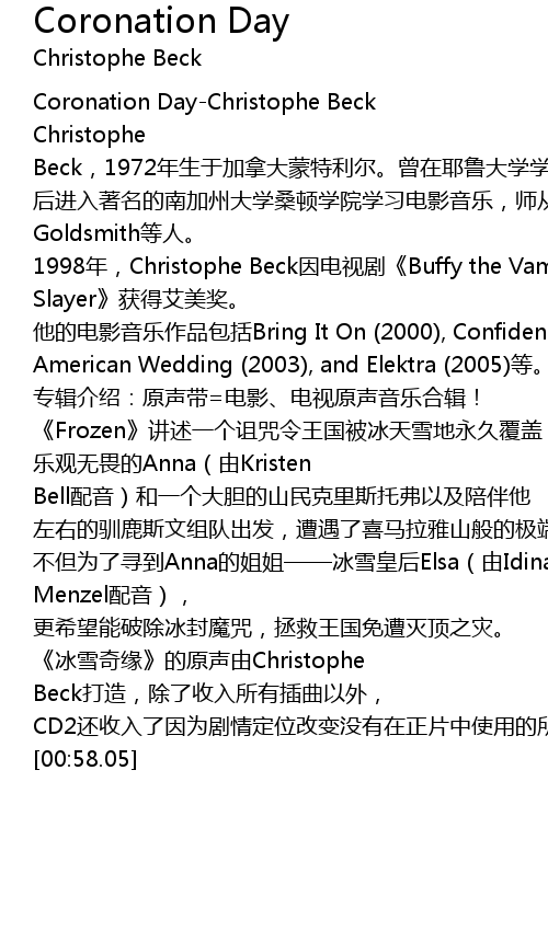 | [00:49.35] | 《冰雪奇缘》的原声由Christophe Beck打造,除了收入所有插曲以外, |