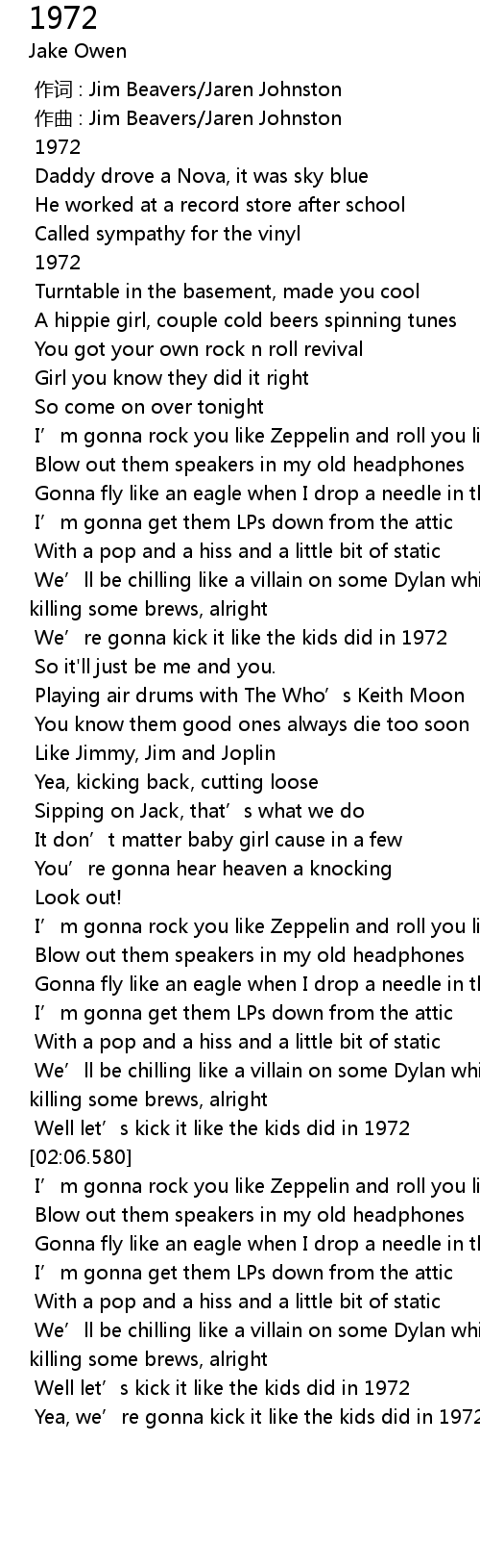 | [02:00.407] | Well let' s kick it like the kids did in 1972 |