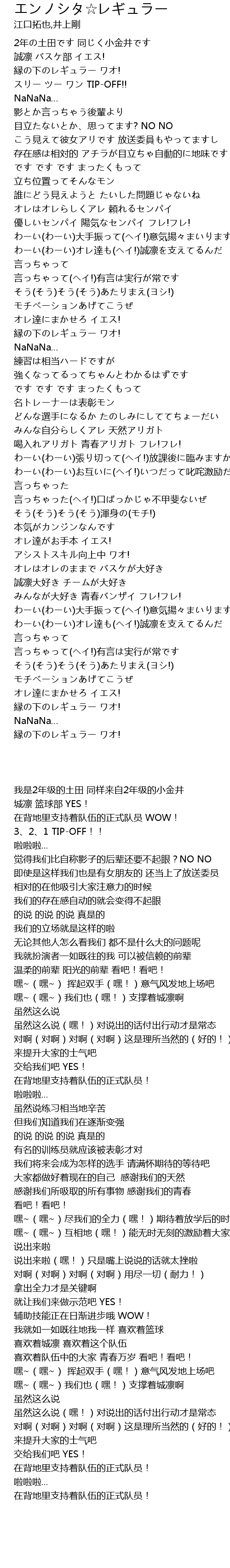 | [03:23.49] | わーい(わーい)オレ達も(ヘイ!)誠凛を支えてるんだ |