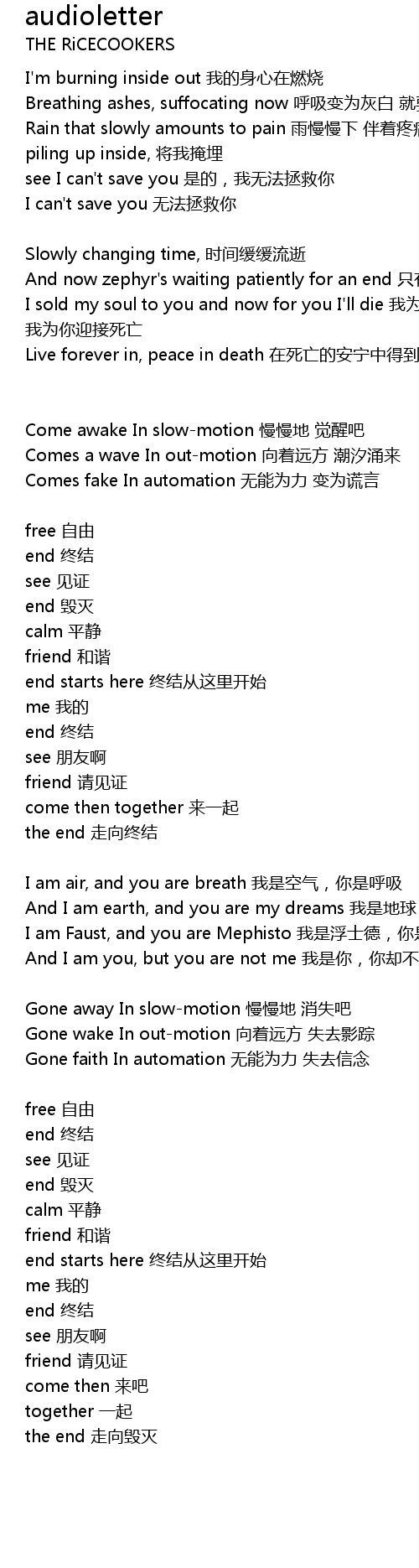 | Breathing ashes, suffocating now 呼吸变为灰白 就要窒息 | |