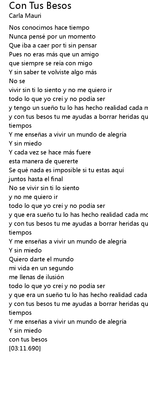 | [02:46.350] | y con tus besos tu me ayudas a borrar heridas que dejaron lo malos tiempos |