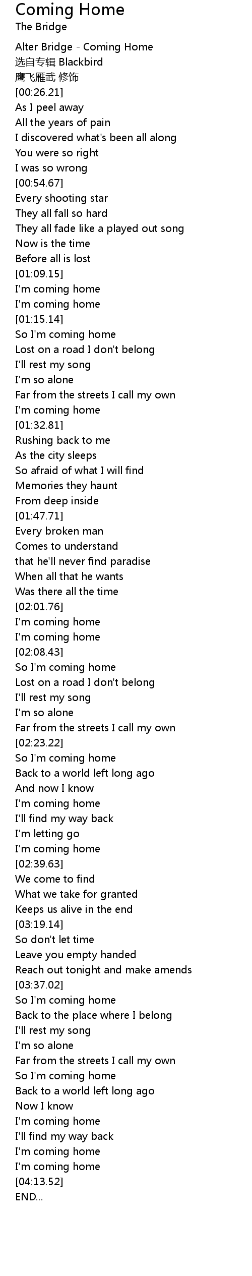 | [00:03.00] | Alter Bridge - Coming Home |