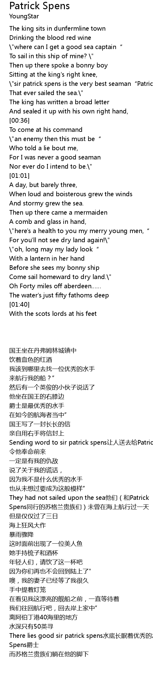 | [00:36] | Sending word to sir patrick spens让人送去给Patrick Spens |