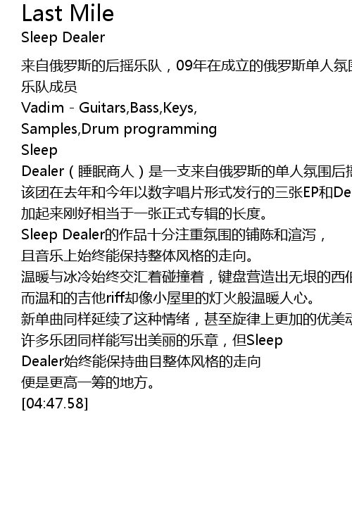 | [00:47.03] | 来自俄罗斯的后摇乐队,09年在成立的俄罗斯单人氛围后摇。 |