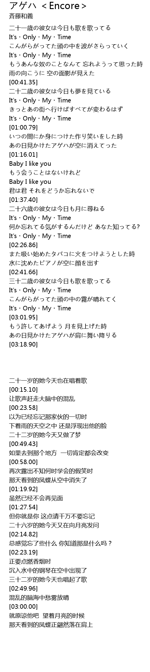 | [03:11.79] | あの日見かけたアゲハが肩に舞い降りる |