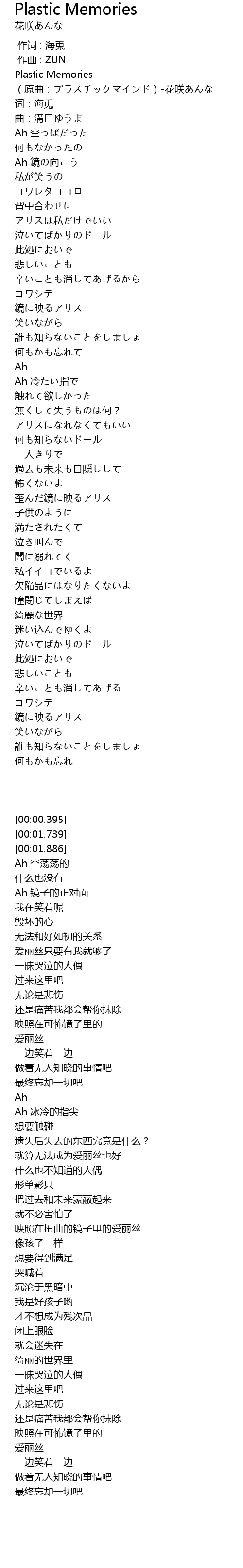 | [00:00.395] | Plastic Memories (原曲:プラスチックマインド)-花咲あんな |