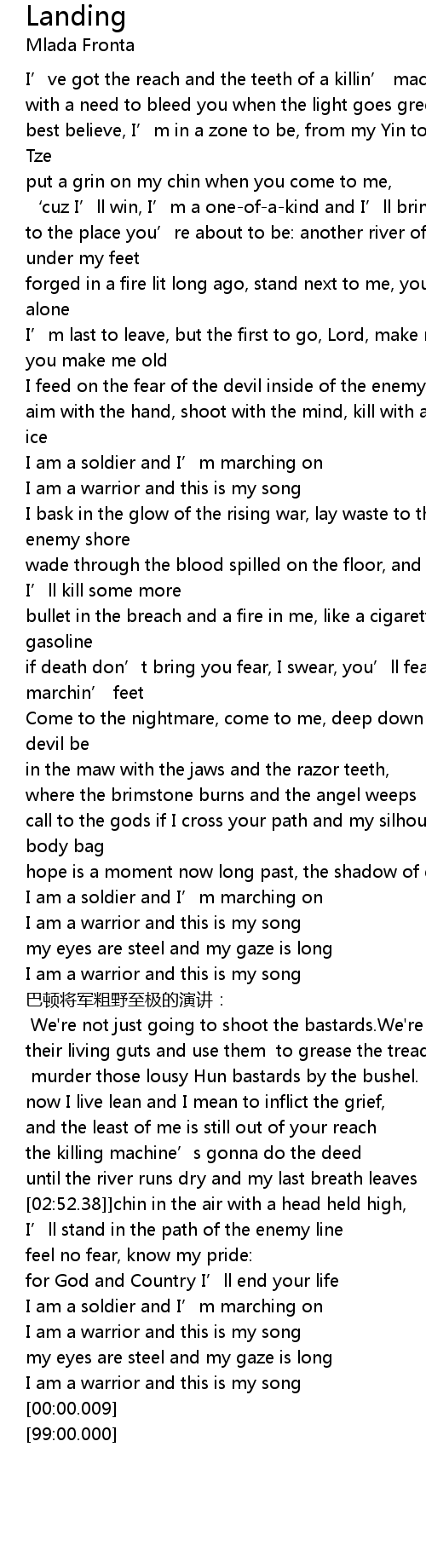 | [01:40.73] | if death don' t bring you fear, I swear, you' ll fear these marchin' feet |
