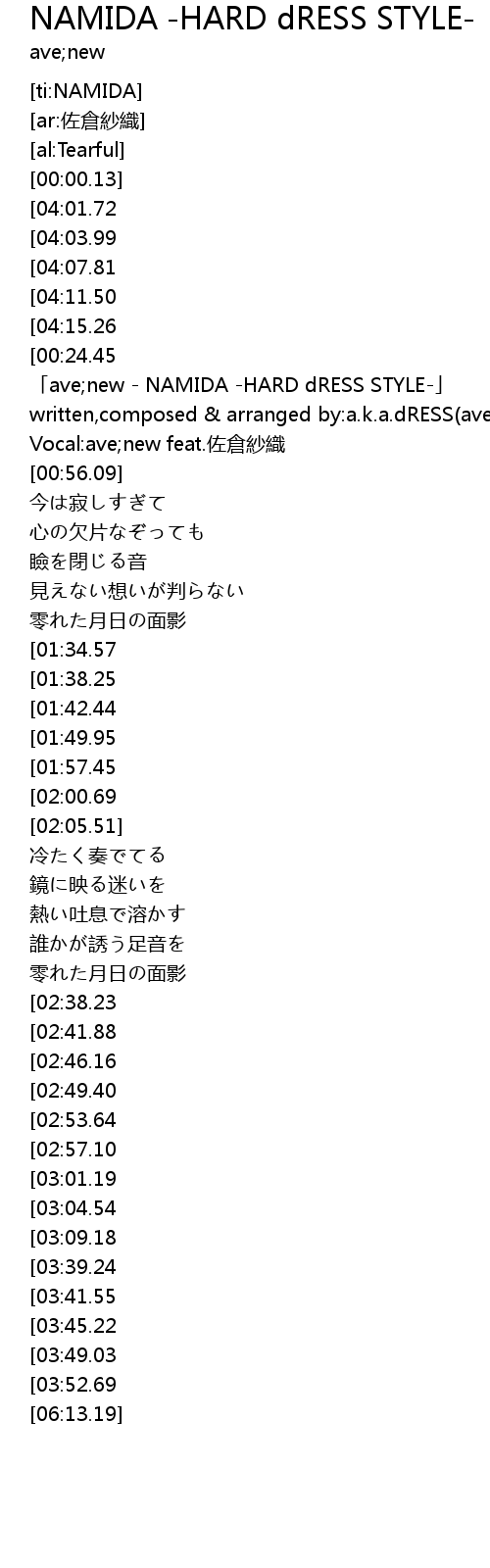 | [00:27.92] | 「ave;new - NAMIDA -HARD dRESS STYLE-」 |