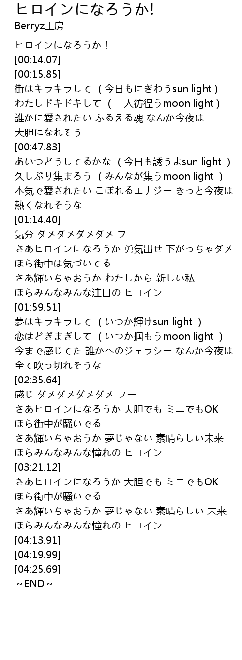 | [03:52.90] | さあ輝いちゃおうか 夢じゃない 素晴らしい 未来 ほらみんなみんな憧れの ヒロイン |