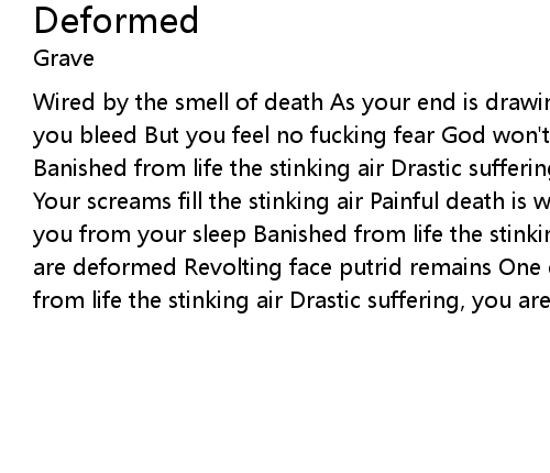 Wired by the smell of death As your end is drawing near He make yo cry he make you bleed But you feel no fucking fear God won't wake you from your sleep Banished from life the stinking air Drastic suffering, you are deformed DEFORMED Your screams fill the stinking air Painful death is waiting you God won't wake you from your sleep Banished from life the stinking air Drastic suffering, you are deformed Revolting face putrid remains One eye left, bloody hands Banished from life the stinking air Drastic suffering, you are deformed |