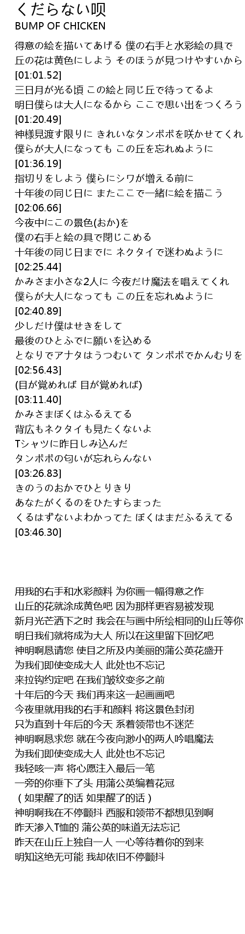 | [03:26.93] | きのうのおかでひとりきり あなたがくるのをひたすらまった |