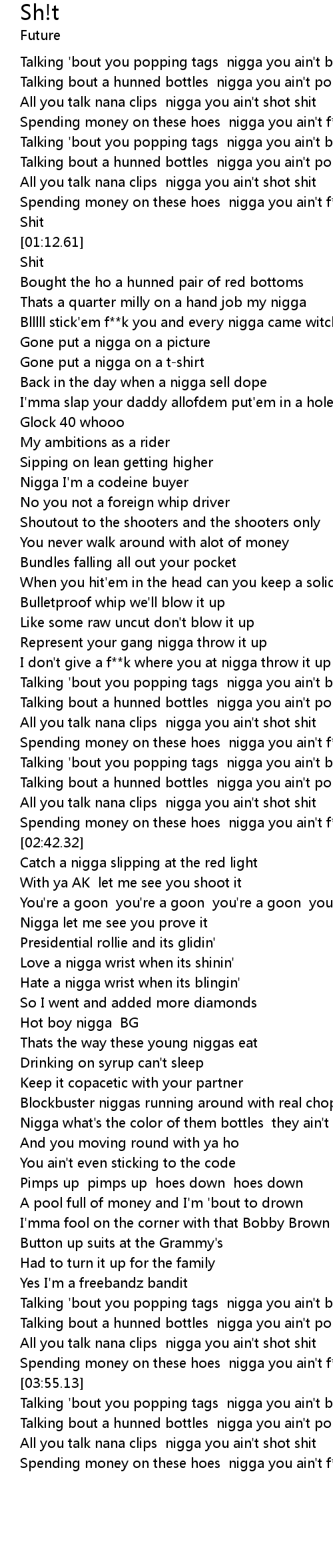 | [01:19.13] | Thats a quarter milly on a hand job my nigga |
