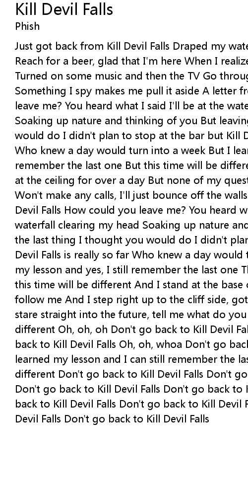 Just got back from Kill Devil Falls Draped my water logged clothes in the hall Reach for a beer, glad that I'm here When I realize that you're not around Turned on some music and then the TV Go through the pile of mail waiting for me Something I spy makes me pull it aside A letter from your hometown How could you leave me? You heard what I said I'll be at the waterfall clearing my head Soaking up nature and thinking of you But leaving's the last thing I thought you would do I didn't plan to stop at the bar but Kill Devil Falls is really so far Who knew a day would turn into a week But I learned my lesson and can still remember the last one But this time will be different until I do it again Stared at the ceiling for over a day But none of my questions are answered this way Won't make any calls, I'll just bounce off the walls Till I go back to Kill Devil Falls How could you leave me? You heard what I said I'll be at the waterfall clearing my head Soaking up nature and thinking of you But leaving's the last thing I thought you would do I didn't plan to stop at the bar but Kill Devil Falls is really so far Who knew a day would turn into a week But I learned my lesson and yes, I still remember the last one This time will be different, this time will be different And I stand at the base of the mountain, don't follow me And I step right up to the cliff side, gotta learn how to leap And I stare straight into the future, tell me what do you see? This time's gonna be different Oh, oh, oh Don't go back to Kill Devil Falls Oh, oh, whoa Don't go back to Kill Devil Falls Oh, oh, whoa Don't go back to Kill Devil Falls Oh, oh I learned my lesson and I can still remember the last one But this time will be different Don't go back to Kill Devil Falls Don't go back to Kill Devil Falls Don't go back to Kill Devil Falls Don't go back to Kill Devil Falls Don't go back to Kill Devil Falls Don't go back to Kill Devil Falls Don't go back to Kill Devil Falls Don't go back to Kill Devil Falls |
