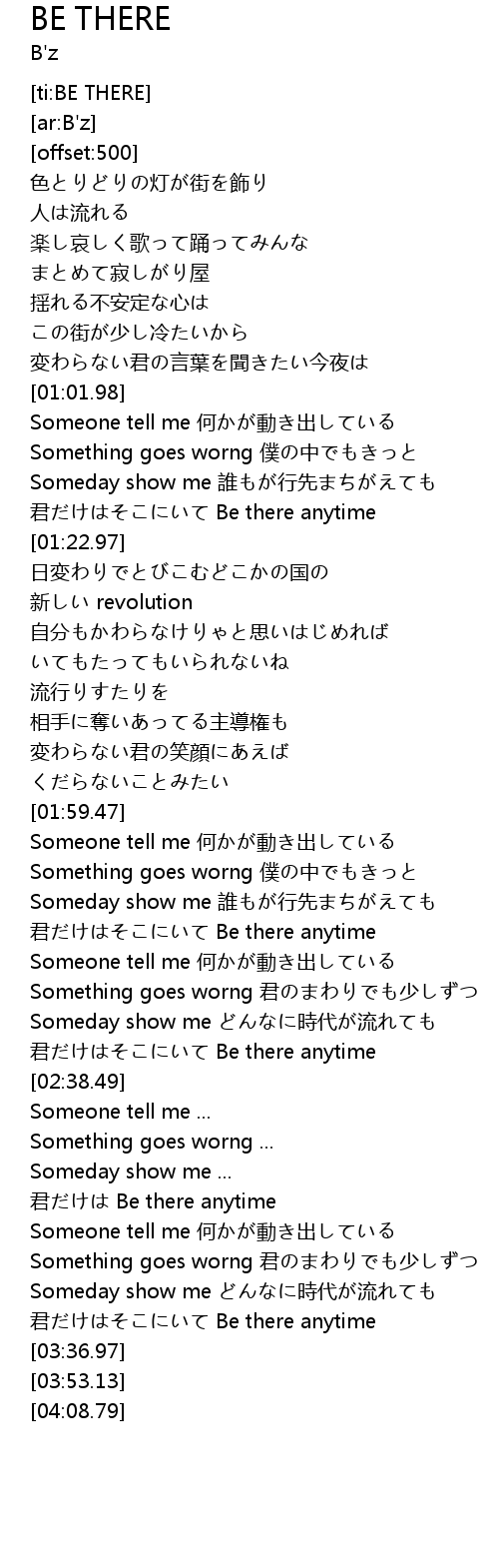 | [03:30.71] | 君だけはそこにいて Be there anytime |