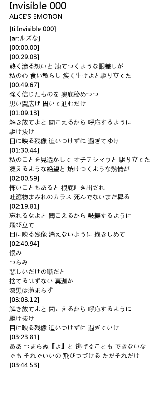 | [03:03.27] | 解き放てよと 聞こえるから 呼応するように 駆け抜け |