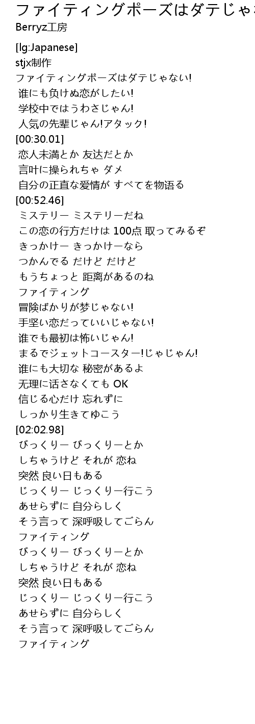 | [00:58.35] | この恋の行方だけは 100点 取ってみるぞ |