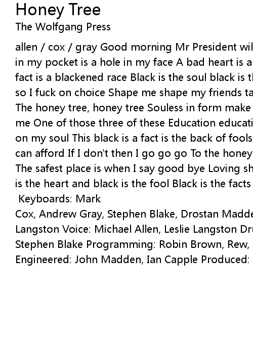allen / cox / gray Good morning Mr President will you sign this grave This hole in my pocket is a hole in my face A bad heart is a bad surprise This black is a fact is a blackened race Black is the soul black is the heart My bodies unsafe so I fuck on choice Shape me shape my friends take them home before they reach The honey tree, honey tree Souless in form make it meet reach out for that funny me One of those three of these Education education pieces Hand on my heart Hand on my soul This black is a fact is the back of fools I've a face in mind one I can afford If I don't then I go go go To the honey tree, honey tree, honey tree The safest place is when I say good bye Loving shoulders is a loving mind Black is the heart and black is the fool Black is the facts is the facts of heart and soul In the honey tree In the honey tree Honey tree [x times] Keyboards: Mark Cox, Andrew Gray, Stephen Blake, Drostan Madden Guitar: Andrew Gray Bass: Leslie Langston Voice: Michael Allen, Leslie Langston Drums: T.W.P., Robin Brown, Stephen Blake Programming: Robin Brown, Rew, T.W.P. Arranged: Drostan Madden Engineered: John Madden, Ian Capple Produced: Drostan Madden, T.W.P. |