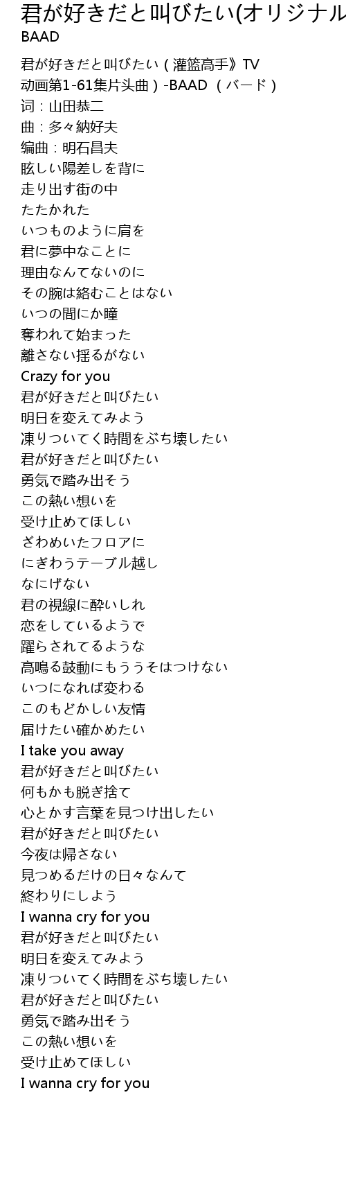 | [00:00.571] | 君が好きだと叫びたい(灌篮高手》TV 动画第1-61集片头曲)-BAAD (バード) |