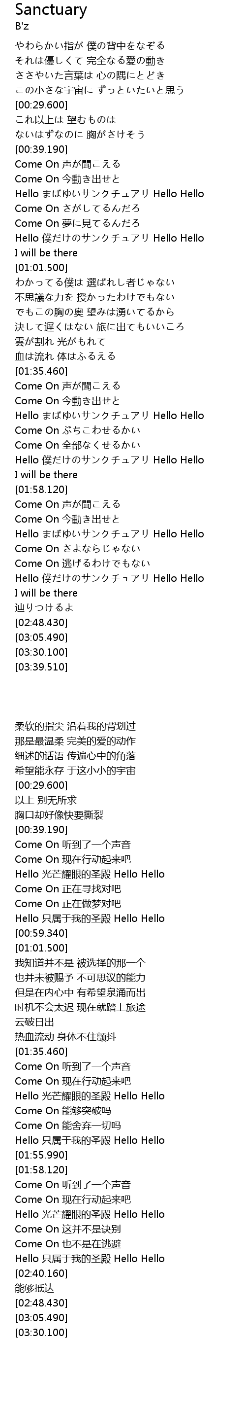 | [01:50.750] | Hello 僕だけのサンクチュアリ Hello Hello |