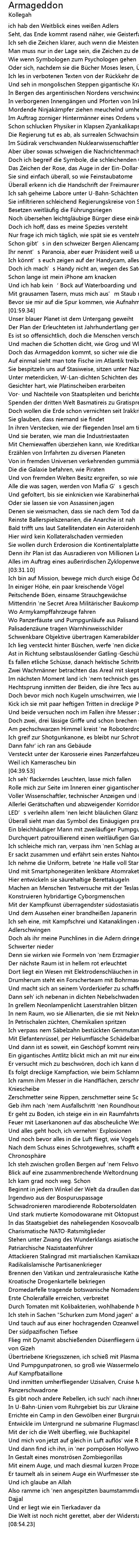 | [06:58.63] | Beginnt in jedem Winkel der Welt da drau en das Armageddon |