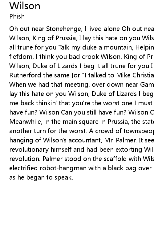 Oh out near Stonehenge, I lived alone Oh out near Gamehendge, I chafed a bone Wilson, King of Prussia, I lay this hate on you Wilson, Duke of Lizards I beg it all trune for you Talk my duke a mountain, Helping Friendly Book Inasfar as fiefdom, I think you bad crook Wilson, King of Prussia, I lay this hate on you Wilson, Duke of Lizards I beg it all trune for you I talked to my son Roger, Rutherford the same [or "I talked to Mike Christian, Rog and Pete the same"] When we had that meeting, over down near Game(henge) Wilson, King of Prussia, I lay this hate on you Wilson, Duke of Lizards I beg it all trune for you You got me back thinkin' that you're the worst one I must inquire, Wilson Can you still have fun? Wilson Can you still have fun? Wilson Can you still have fun? Wilson Meanwhile, in the main square in Prussia, the state of the revolution was taking another turn for the worst. A crowd of townspeople had gathered to witness the hanging of Wilson's accountant, Mr. Palmer. It seemed that Palmer had been a revolutionary himself and had been extorting Wilson's money to fund the revolution. Palmer stood on the scaffold with Wilson and the AC/DC Bag, an electrified robot-hangman with a black bag over his head. Wilson seemed pleased as he began to speak.