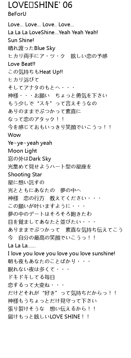 | [00:15.32] | La La La LoveShine…Yeah Yeah Yeah! |