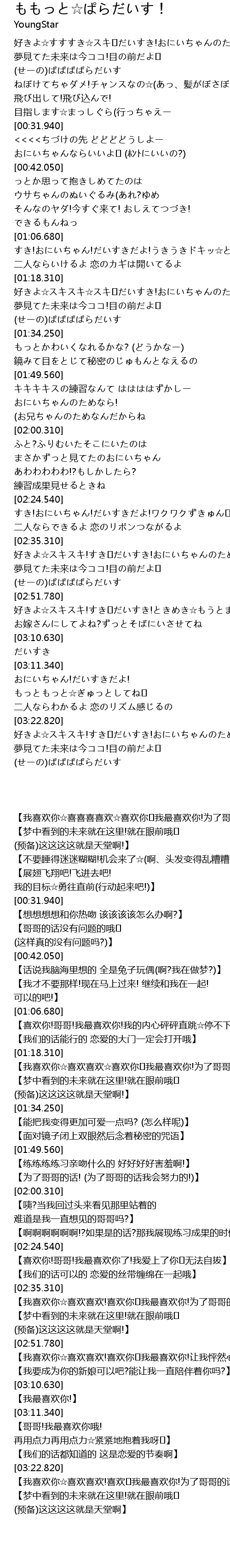 | [00:02.550] | 好きよ☆すすすき☆スキ♥だいすき!おにいちゃんのためにもっと |