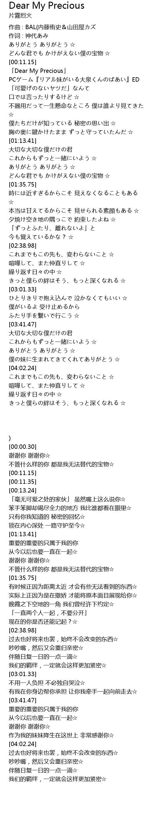 | [03:41.88] | 重要的重要的只属于我的你 从今以后也要一直在一起☆ |