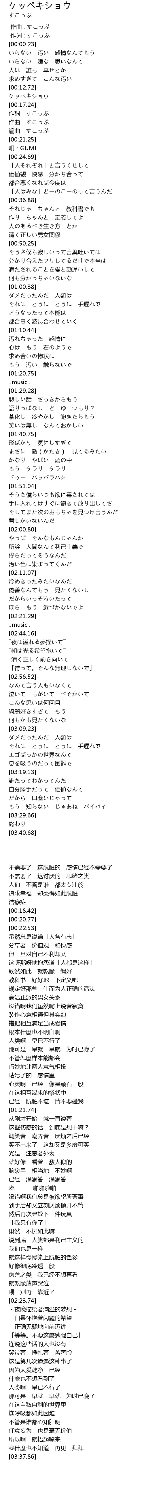 | [00:14.28] | ケッペキショウ |