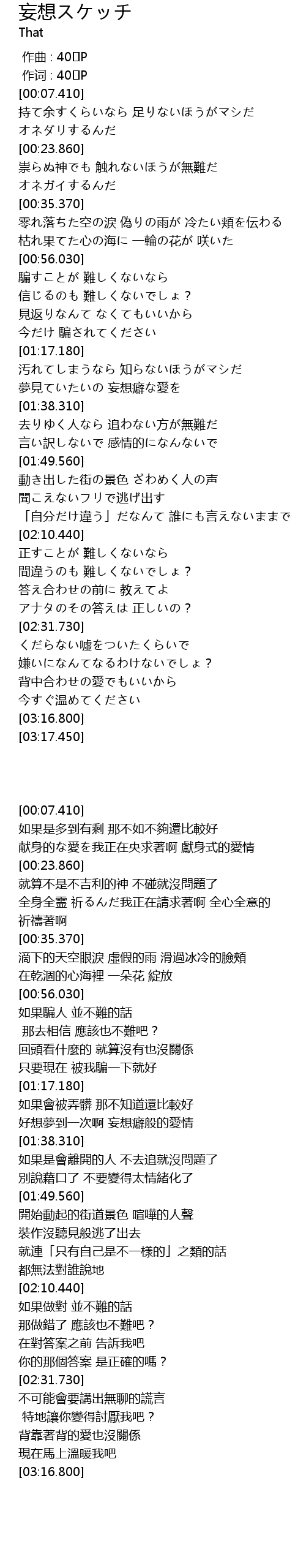 | [01:33.130] | 夢見ていたいの 妄想癖な愛を |